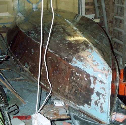 And here we have a shiny boat all sticky with new epoxy! The bow sections are a pain to sand or strip - there's a lot of filler there so heat and chemical were difficult to use, and sanding is prone to lose wood on such curved surfaces. In the end I left quite a lot of paint where it was really thoroughly attached. You can see blotches on the rest of the boat where there's still a significant amount of primer left. They're 3mm ply, remember, and you just cannot be too aggressive with them. Maybe I should be, I don't know. We'll find out in 10 years time!